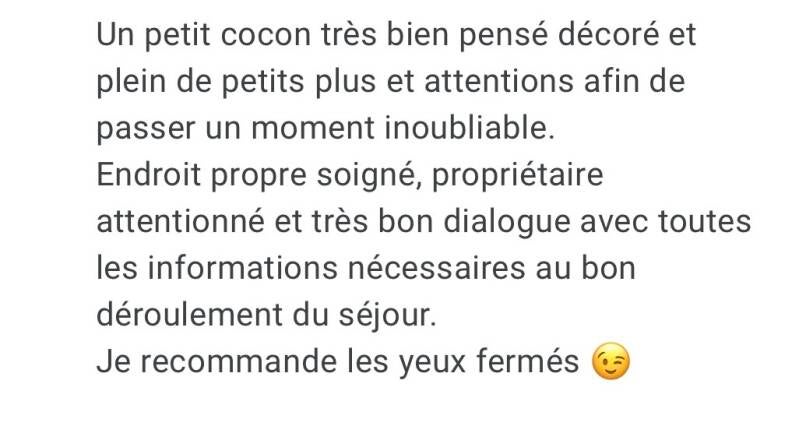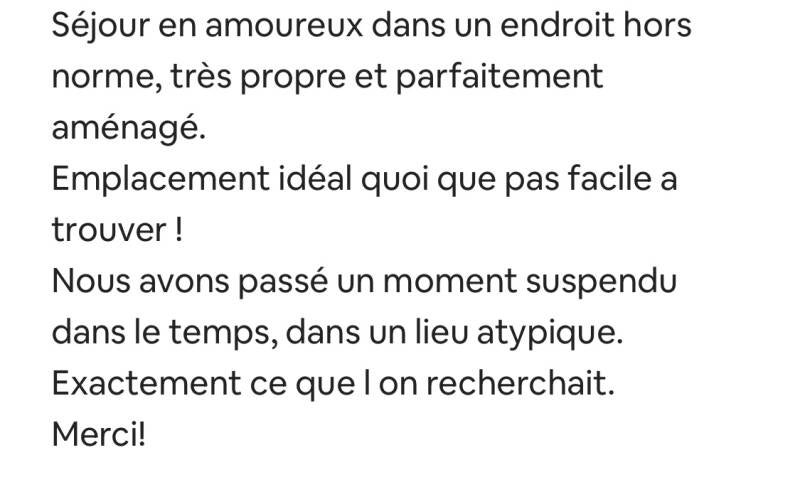 Séjour en amoureux dans un endroit hors norme, très propre et parfaitement aménagé. Emplacement idéal quoi que pas facile à trouver ! Nous avons passé un moment suspendu dans le temps dans un lieu atypique.....